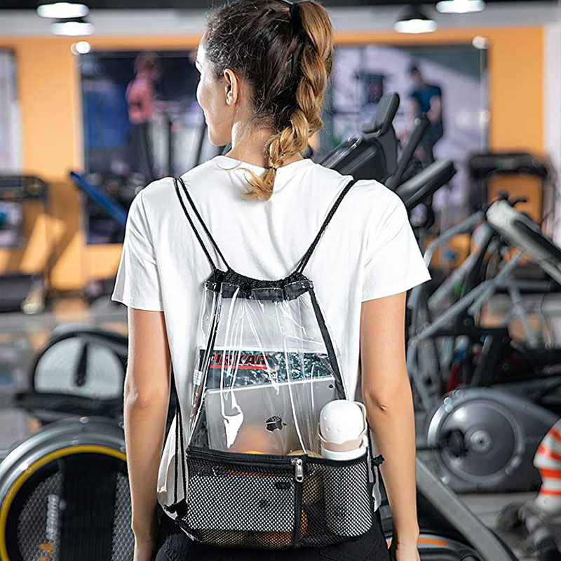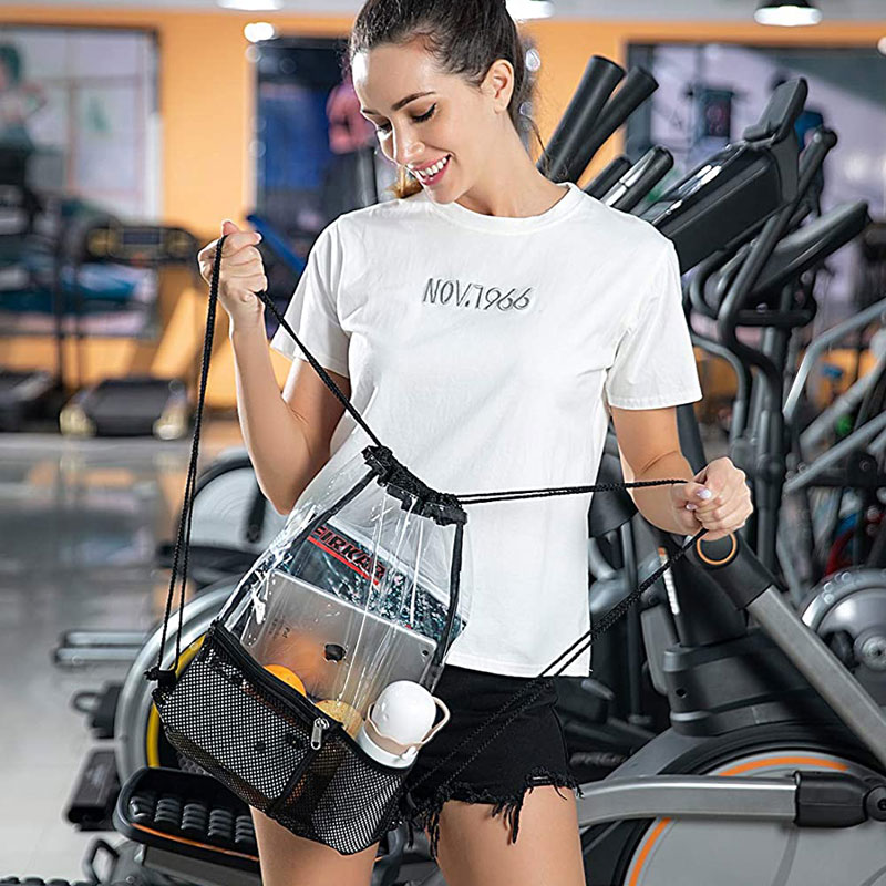 · Transparent String Backpack--- ថង់ខ្សែត្រូវបានផលិតពី PVC ថ្លា ធន់ មិនជ្រាបទឹក និងធន់នឹងត្រជាក់។ កាបូបដែលមើលឃើញទាំងស្រុងអនុញ្ញាតឱ្យអ្នកទទួលបានការត្រួតពិនិត្យសុវត្ថិភាពយ៉ាងងាយស្រួល។